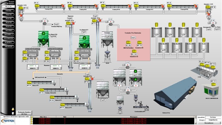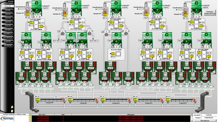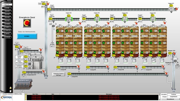 A engenharia fez todo desenvolvimento de projetos dos painéis e projetos de instalação de infraestrutura, configuração do PLC e sistema supervisório, parametrização de softstarter e inversores de frequência.